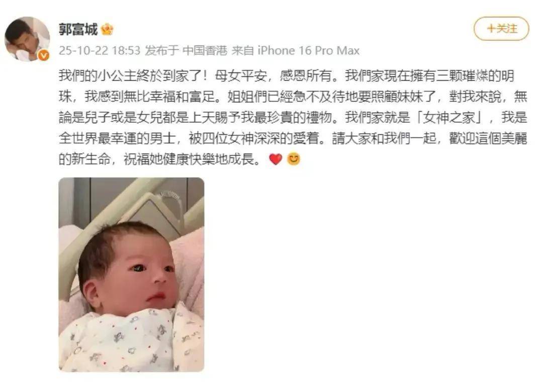 郭富城的三胎女儿因年纪太小并未现身生日宴,就在五天前,她才刚刚被郭富城从医院接回家。小女儿长相十分可爱,眼睛漂亮,鼻梁高挺,与方媛颇为相像。不得不说,方媛很会生,三个女儿一个比一个漂亮。